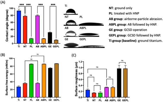 Surface characterization. (A) Static contact angle in distilled water. (B) SFE calculated using water and diiodomethane. (C) Ra. Symbols: *** p < 0.001; ns, not significant (p > 0.05).