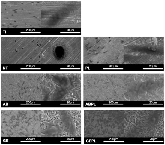 FE-SEM revealed polished features on Ti, NT, and PL, whereas AB and ABPL showed irregular, markedly roughened microtopographies (Figure 2). GE and GEPL exhibited the canonical interlaced rod-/needle-like lithium silicate/disilicate texture, indicating robust coating adhesion and crystallization, in agreement with prior literature []. Given the abundance of polar Si–O–Si motifs in the glass–ceramic, hydrogen bonding with water is favored [,]; HF also removes residual contaminants, jointly enhancing hydrophilicity []. The CA data (Figure 3) showed hydrophobic Ti (CA > 90°), hydrophilic NT and AB (CA < 90°), and highly hydrophilic GE (CA < 30°), confirming a pronounced wettability gain with GCSD. Although HNP did not appreciably alter FE-SEM features or roughness (Figure 3), it produced pronounced chemical effects, such as removal of organics and generation of oxide/–OH functionalities, which increased SFE and wettability [,]. Post-HNP, CA values approached 10° across groups, with GEPL falling below 10°, indicative of a superhydrophilic surface that favors early cell attachment []. Overall, GCSD combined with HNP (GEPL) concurrently delivers micro-roughness and chemical activation.