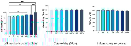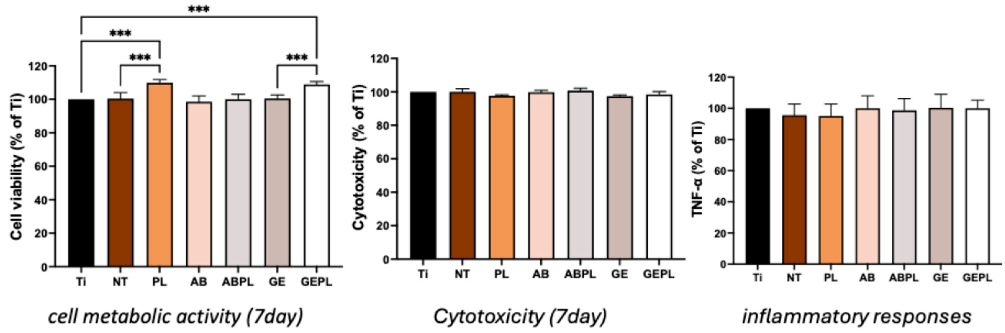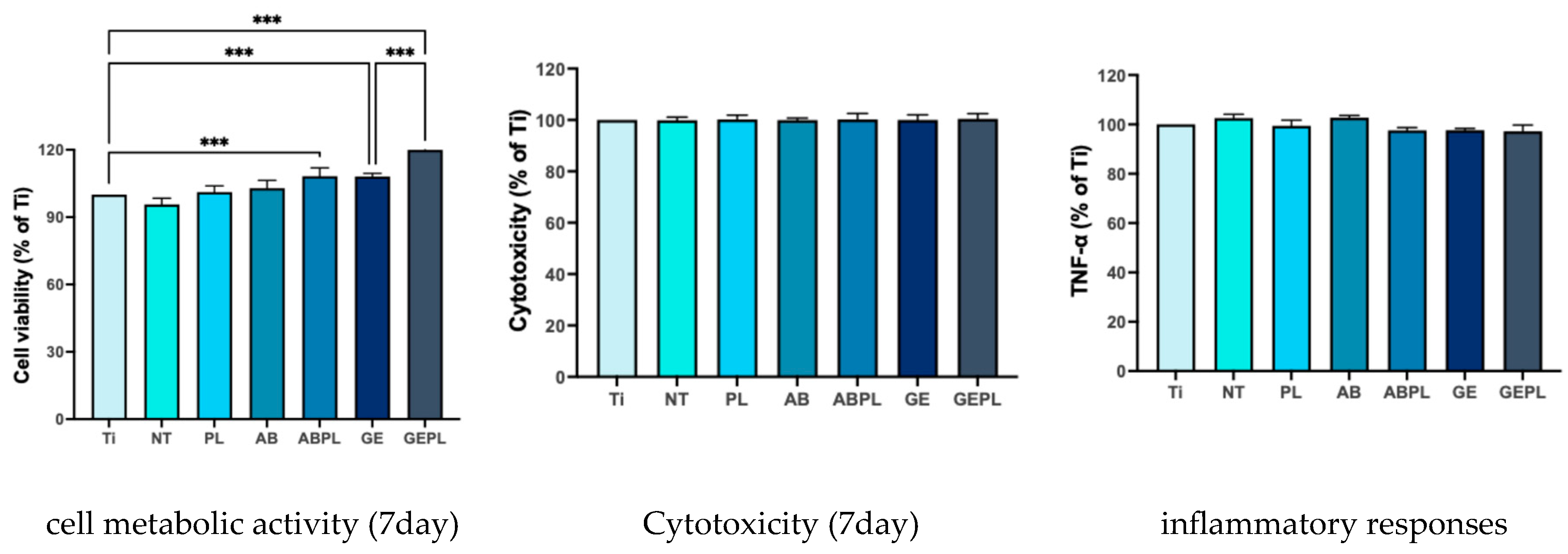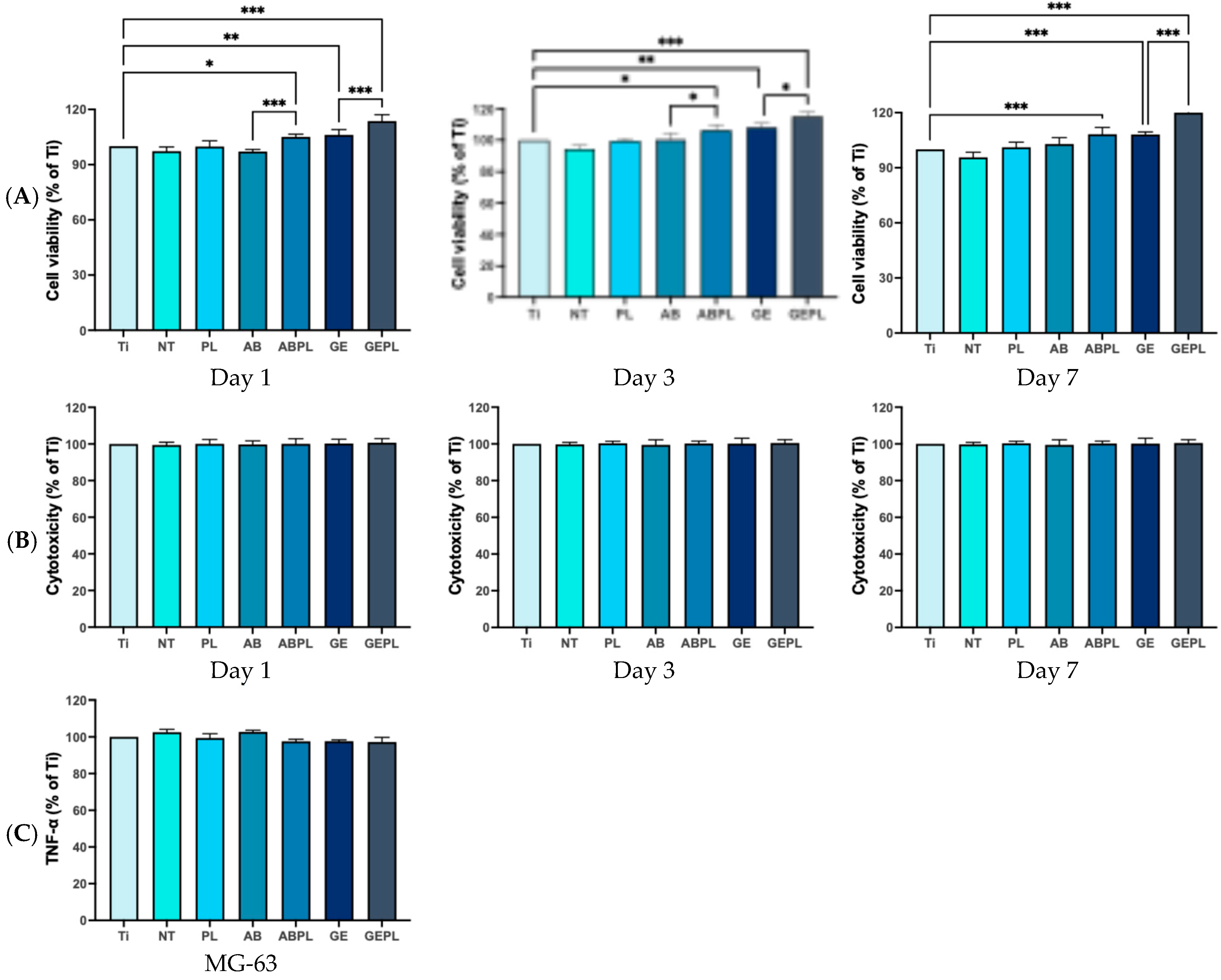 Figure 6 and Figure A1 show MG-63 viability. Using Ti as baseline, ABPL, GE, and GEPL were significantly higher on day 1 (p < 0.05), with HNP further increasing activity within the same substrates (AB vs. ABPL and GE vs. GEPL; p < 0.001), a pattern persisting through day 3. By day 7, ABPL, GE, and GEPL remained significantly higher than baseline (p < 0.001), whereas AB did not differ from ABPL (p = 0.06). It also shows cytotoxicity toward MG-63 that no significant differences were detected at any time point (p > 0.05). Moreover, the results show TNF-α, which remained comparable across groups (p > 0.05).