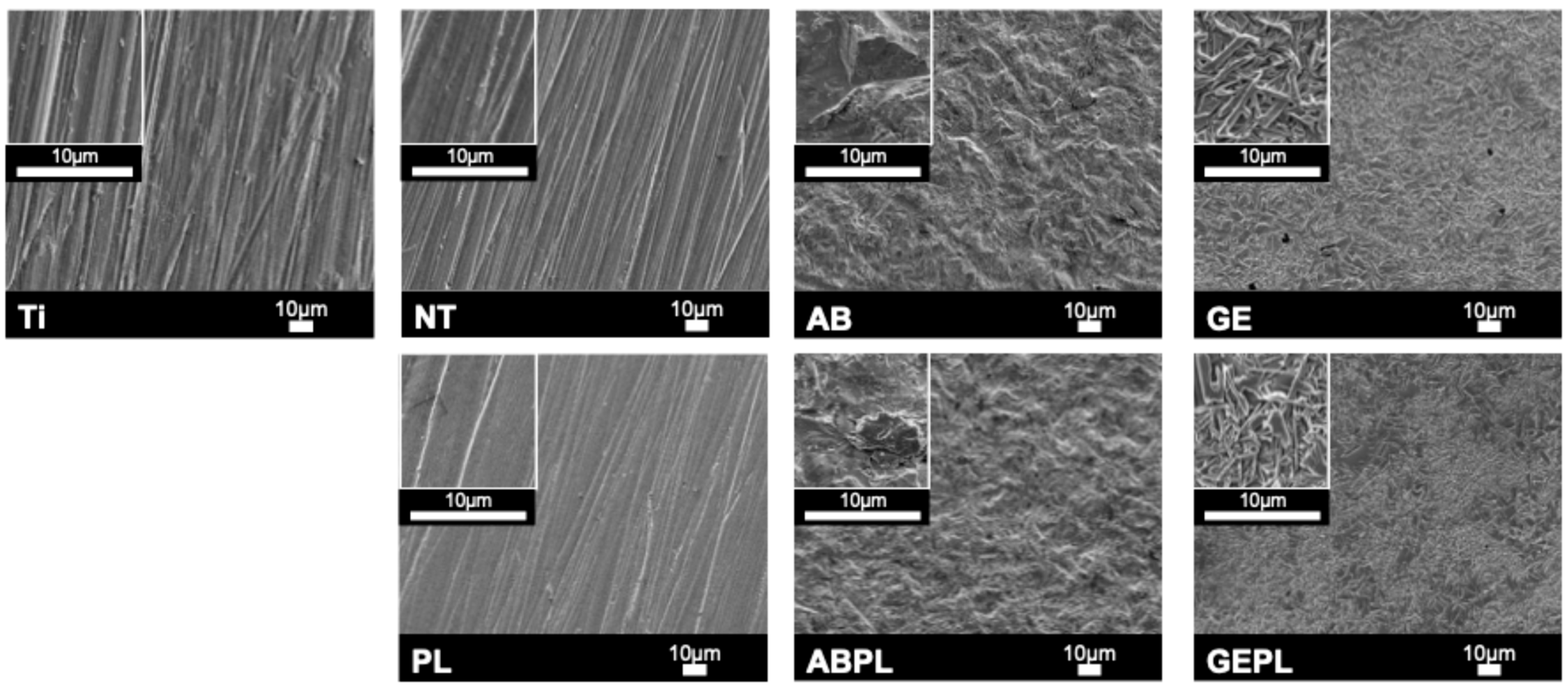 Figure 2 shows FE-SEM microtopography for each group. Ti, NT, and PL surfaces appeared homogeneous and flat, with fine polishing striations. AB and ABPL exhibited irregular, undulating roughness with pronounced relief. After HF etching, GE and GEPL displayed a precipitated glassy phase where rod-like lithium metasilicate and needle-like lithium disilicate interlaced to form a dense, interlocking glass–ceramic network. EDS semi-quantitative analysis (Table 1) revealed that Ti is mainly composed of titanium, aluminum, and vanadium, while NT and PL are mainly composed of zirconium, yttrium, and oxygen. Aluminum was detected in AB and ABPL. GE and GEPL showed high silicon contents. HNP treatment consistently reduced surface carbon across groups.