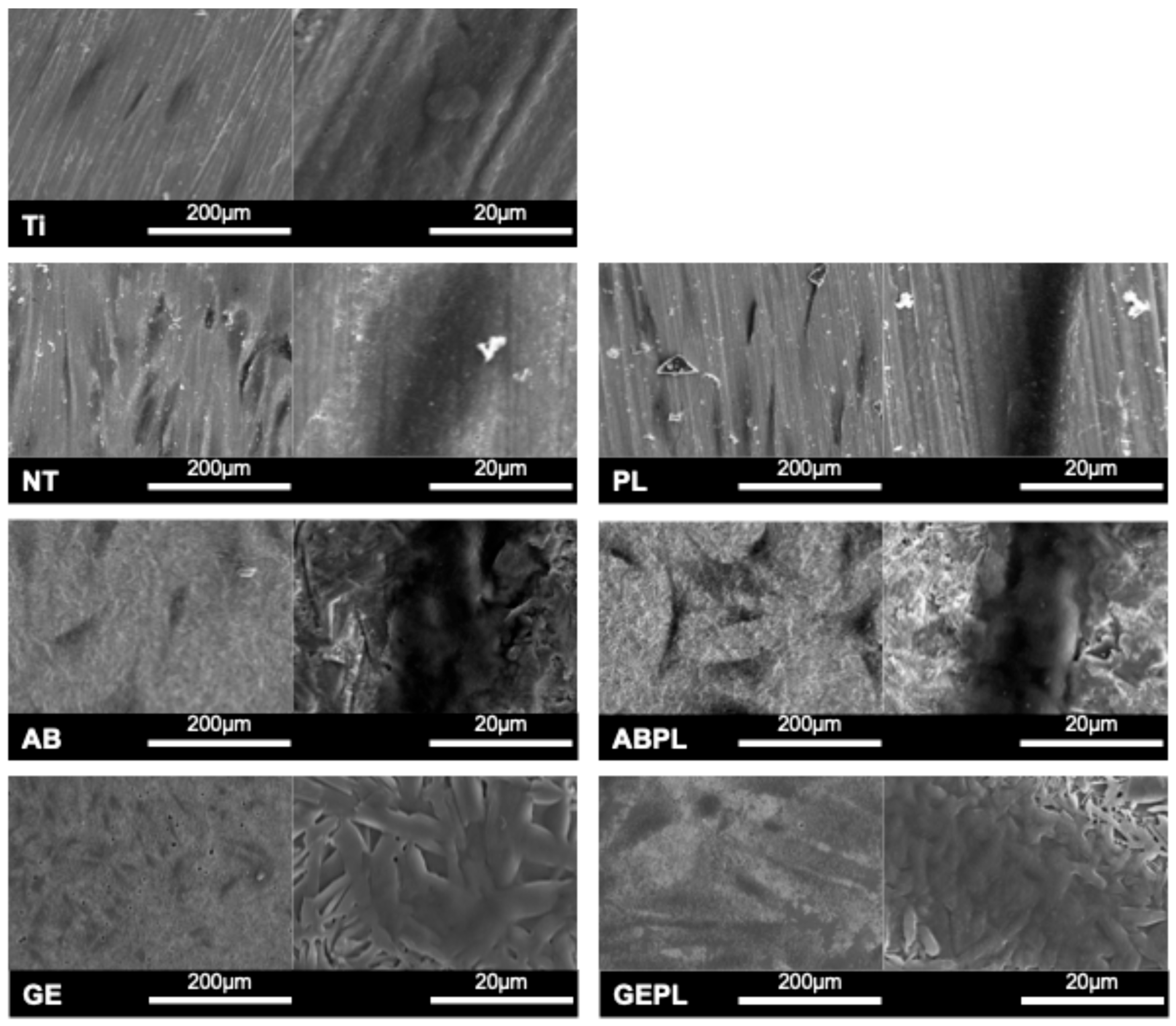 Figure 3A,B summarize CA and SFE. Without HNP, Ti showed the highest water CA (93.16°), indicating the poorest hydrophilicity; NT and AB were intermediate, whereas GE exhibited the lowest CA (31.69°), demonstrating that the glass–ceramic coating significantly enhanced wettability (p < 0.05). After HNP (PL, ABPL, GEPL), CAs decreased significantly in all groups (p < 0.05). Nearly complete droplet spreading was observed on GEPL, which yielded the lowest CA (9.96°); PL and ABPL also approached 10°, consistent with a superhydrophilic surface. In addition, SFE was highest for GE among non-HNP groups (75.47 mN/m), significantly exceeding Ti, NT, and AB (p < 0.05). HNP further increased SFE in all groups, with GEPL reaching the highest value (86.98 mN/m), mirroring its minimal CA. Figure 3C shows Ra. NT had the lowest mean Ra (0.15 µm), with no significant difference from Ti (0.18 µm) or PL (0.18 µm) (p = 0.06). AB and ABPL increased to approx. 0.65 µm, while GE and GEPL exceeded 0.92 µm, indicating pronounced roughening from GCSD. Within each surface treatment, HNP did not alter Ra (p > 0.99).