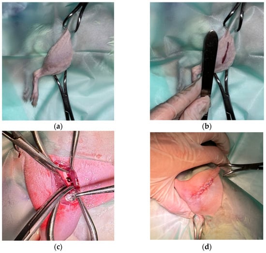 Under aseptic conditions, a cranio-lateral skin incision was made over the right femur. Blunt dissection was carried out between the biceps femoris and fascia lata to expose the femoral diaphysis without damaging the periosteum. A standardized cortical bone defect, 3 mm in length, was created using a 1.2 mm diamond burr, with continuous saline irrigation to prevent thermal injury. Then, the defect was filled with either Mg-Nd or Mg-Zn powder. The wound was closed in three layers using 4-0 absorbable monofilament sutures for fascia and subcutaneous tissue, and 4-0 non-absorbable nylon in an interrupted pattern for the skin (Figure 2).