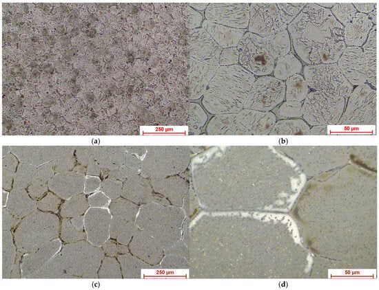 Optical microscopy images showing the microstructural aspects of Mg-Nd alloy: (a) magnification 10×; (b) magnification 50×; and Mg-Zn alloy: (c) magnification 10×; (d) magnification 50×.