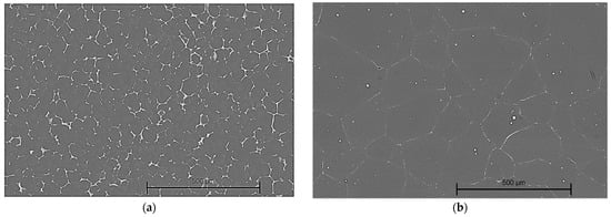 The manufacturing technology of Mg-based alloys has a significant impact on the elastic modulus and compressive strength of the material. For instance, in the case of our cast alloys, when compared to the other technologies, less optimized mechanical properties could be achieved because the coarse grain structure leads to lower values of Young’s modulus and compressive strength [,]. The wrought processes typically result in a reduced grain size by promoting the precipitation process and enhancing the aforementioned mechanical properties [,]. Regarding the additive manufacturing technology, high-temperature working conditions are directly linked to differences in mechanical performance, while low-temperature methods lead to higher mechanical properties []. For Mg-based alloys manufactured through powder metallurgy, the compressive strength value is influenced by the powder content and production conditions []. To summarize these findings, one can notice that the choice of manufacturing technology influences the material microstructure, with direct implications for Young’s modulus and compressive strength.
