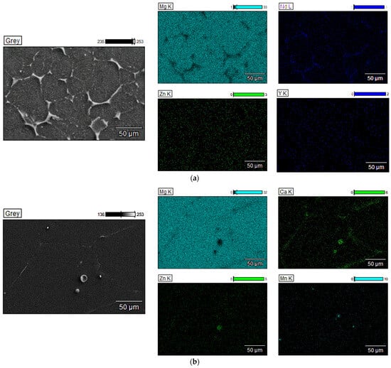 In the case of the second investigated alloy, Mg-Zn, SEM images showed an α-Mg matrix with secondary phases localized mainly at the grain boundaries in a strip-like structure. EDS analysis revealed a chemical composition (Figure 8b) for these secondary phases with elements such as Mg, Ca, and Zn, and a localized distribution of Mn.