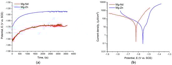 The Mg-Nd and Mg-Zn corrosion process was investigated based on electrochemical analysis. In the case of the above-mentioned method, we chose simulated body fluid (SBF) because this electrolyte has a chemical and ionic composition similar to that of human blood plasma []. The SBF was prepared in our laboratory using the Kokubo protocol [] and characterized by a physiological pH of 7.4.