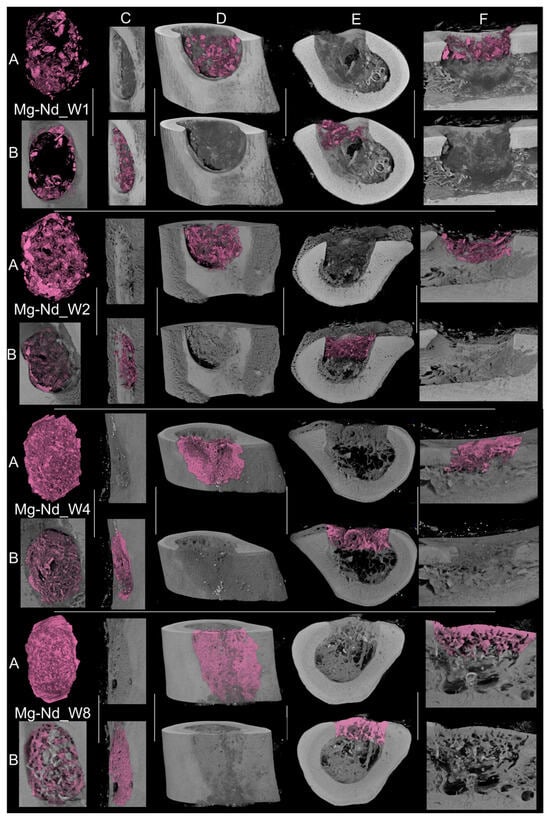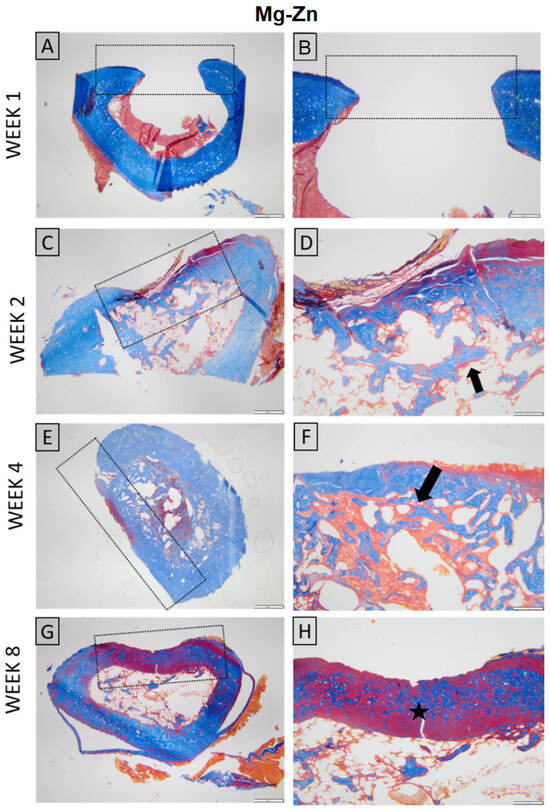 The bone implantation was conducted on 40 animals, randomly allocated into two experimental groups (n = 20), of which samples of Mg-Nd and Mg-Zn alloys were used. Five animals from each group were euthanized at the same intervals of 1, 2, 4, and 8 weeks for the collection of the bone tissue. The rationale for choosing an investigation time of a maximum of 8 weeks to collect bone tissue was in accordance with many literature studies that involved bone defects in Sprague Dawley rats and evaluated local and systemic biocompatibility in both soft and hard tissues, rather than long-term bone regeneration and complete material degradation. Therefore, the selected time point corresponds to an acute phase assessment, in accordance with ISO 10993-6 [] recommendations for biological evaluation of medical devices [,]. This time was considered sufficient for the natural bone healing process with substantial but not complete remodeling or bone formation []. The study of Nowak et al. [] recommended 12 weeks for complete healing. However, an 8-week approach is a more adequate choice when biodegradable metals such as Mg alloys are used, as it allows for the study of early bone mineralization and new bone formation in conjunction with alloy degradation []. This process is synchronically connected with its replacement by animals’ natural hard tissue, and by choosing 8 weeks as a correct time, an in vivo evaluation before complete bone maturation could be conducted [,,]. Most of the research studies opted for a maximum of 8 weeks for the investigation time based on practical considerations because at this point, important effects of the bone substitute are usually still present [,]. In addition, at the 1-week time point, early molecular and cellular mechanisms such as the onset of osteogenesis and inflammation could be studied []. At 2 weeks, osteogenesis and angiogenesis are enhanced due to the action of Mg2+ ions [,,], while at 4 weeks, early bone formation and osteoblast activity can be monitored [].