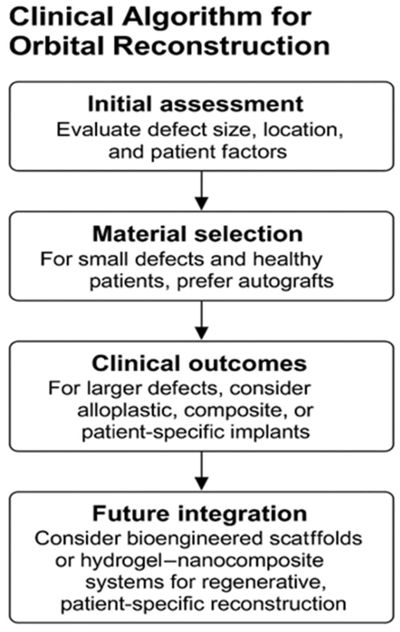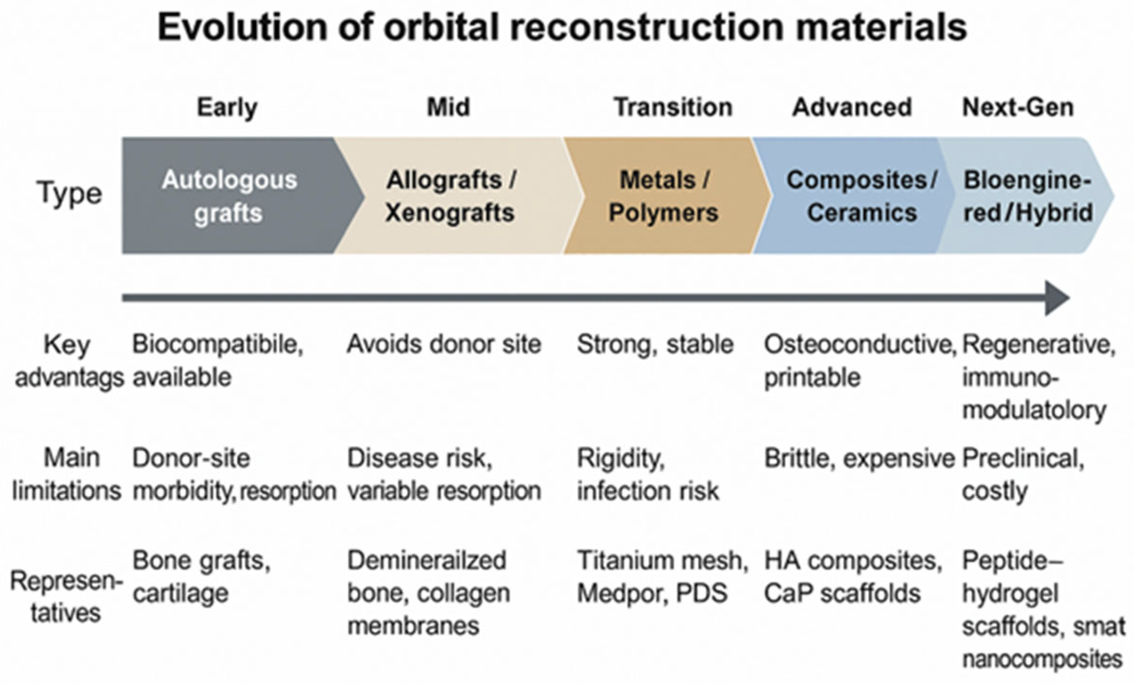 | Polymers (resorbable) | PLLA, PDS, PGA, copolymers | Eliminates second surgery; avoids growth restriction in children | Limited strength; unpredictable degradation; local inflammation possible | Preferred in pediatric or small orbital defects |