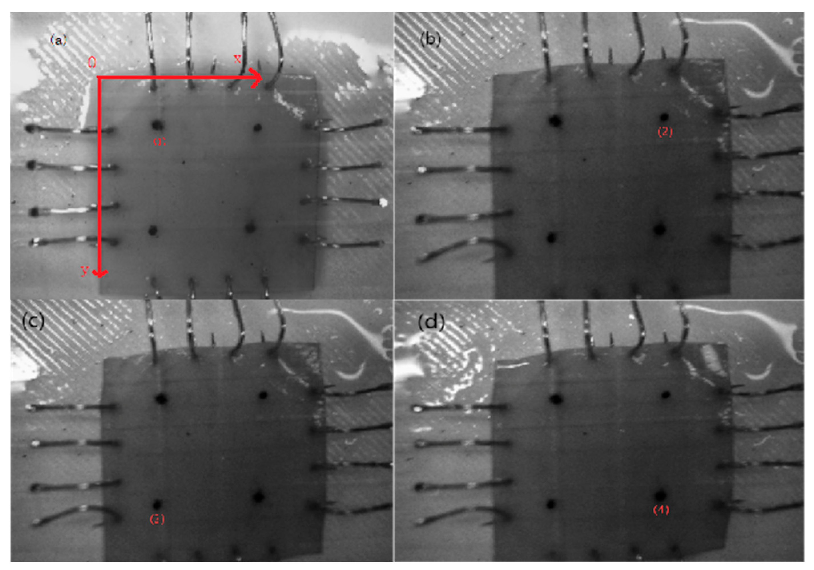 xOy) was defined, with points (1)–(4) corresponding to the marker positions used for biaxial displacement tracking. Calculate the elongation changes in the sample in two directions using the Euclidean formula as: