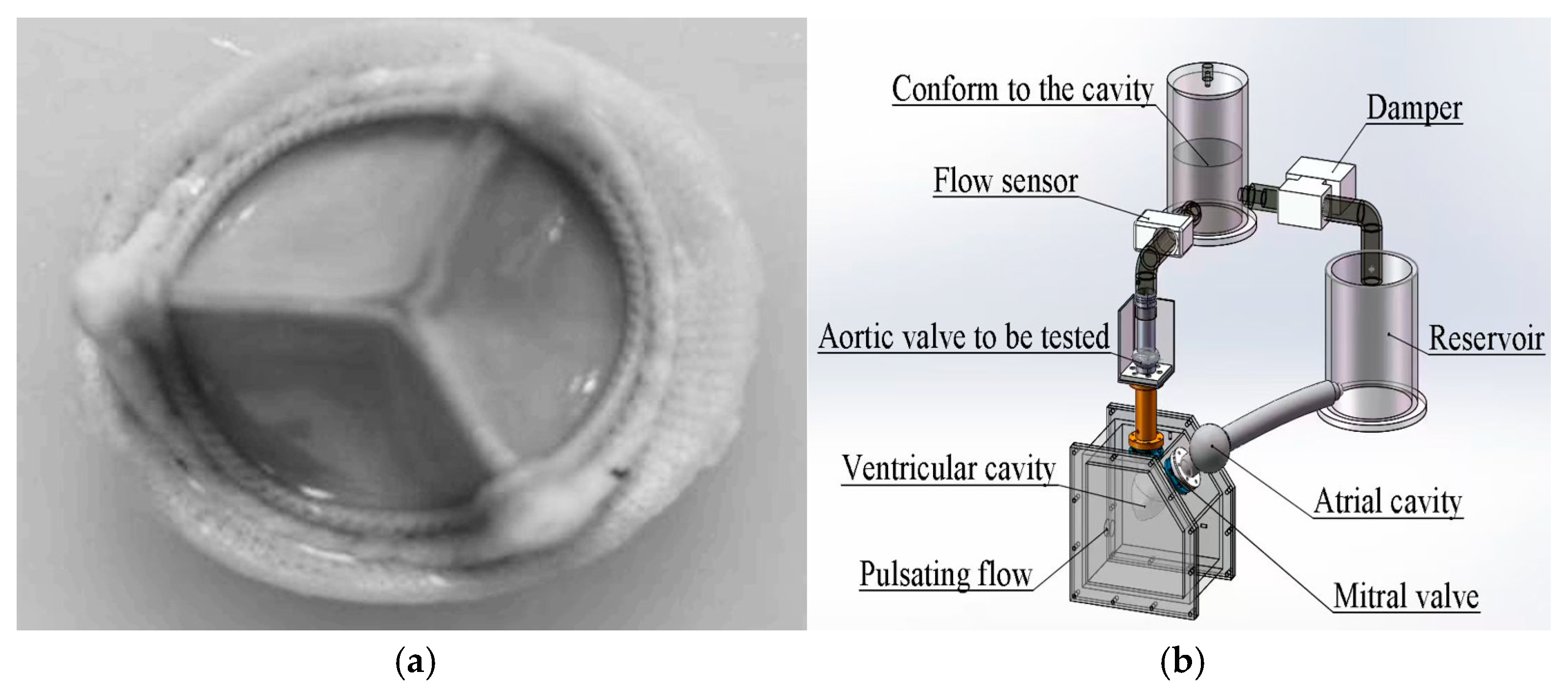 - Rassoli, A.; Fatouraee, N.; Guidoin, R.; Laroche, G.; Mirzarezapour, B.; Cosentino, F.; Movahed, A.; Ghasemi, A.; Saidi, M.S.; Shojaei, A. A Comparative Study of Different Tissue Materials for Bioprosthetic Aortic Valves Using Experimental Assays and Finite Element Analysis. Comput. Methods Programs Biomed. 2022, 220, 106813. [Google Scholar] [CrossRef] [PubMed]