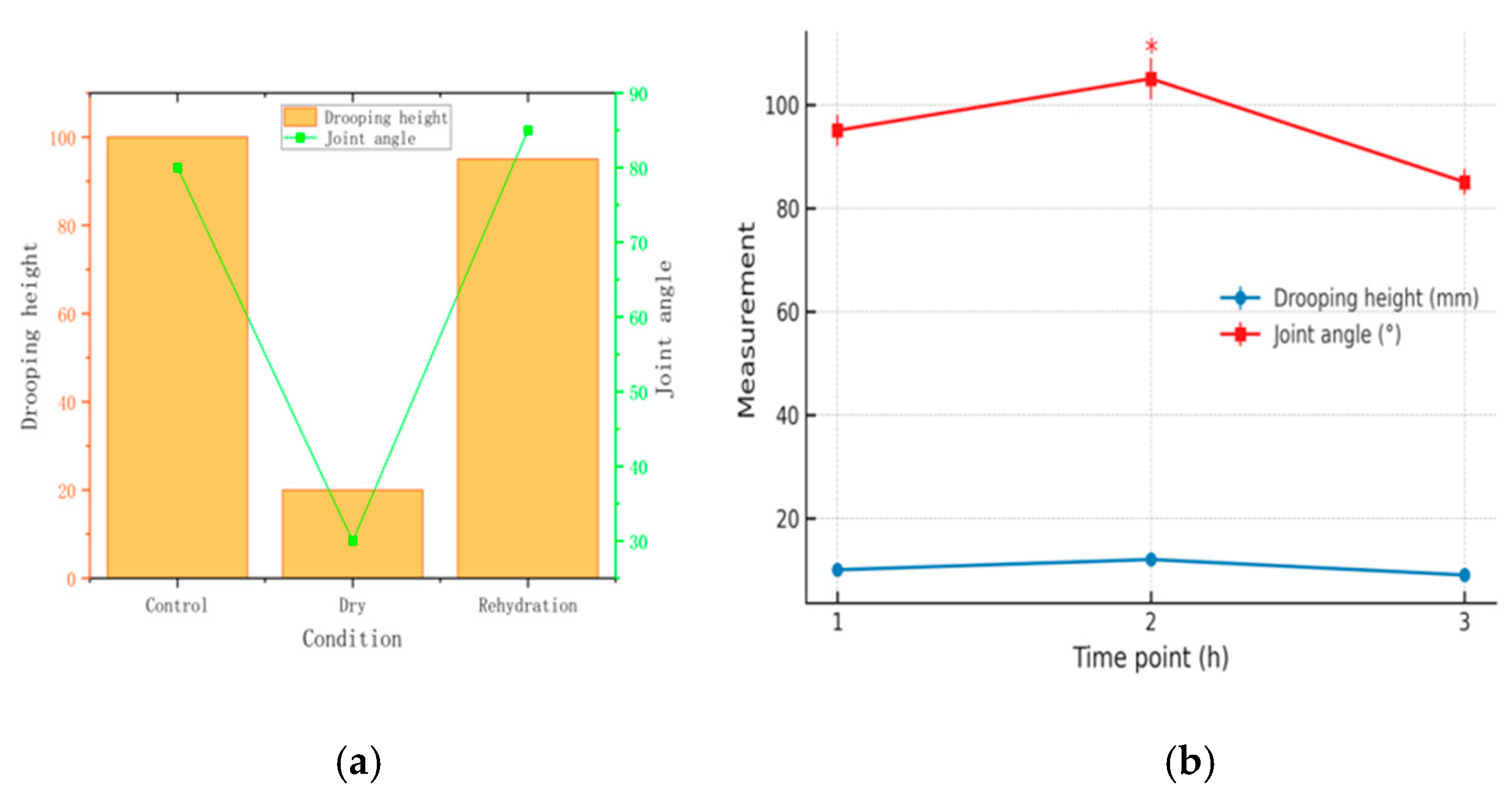Changes in Drooping Height and Joint Angle Before Drying, After Drying, and After Rehydration: The rehydrated pericardium maintained geometric stability with minimal changes in drooping height (38.94 mm preserved) and joint angles compared to the control group, demonstrating superior dimensional stability relative to alternative preservation methods (