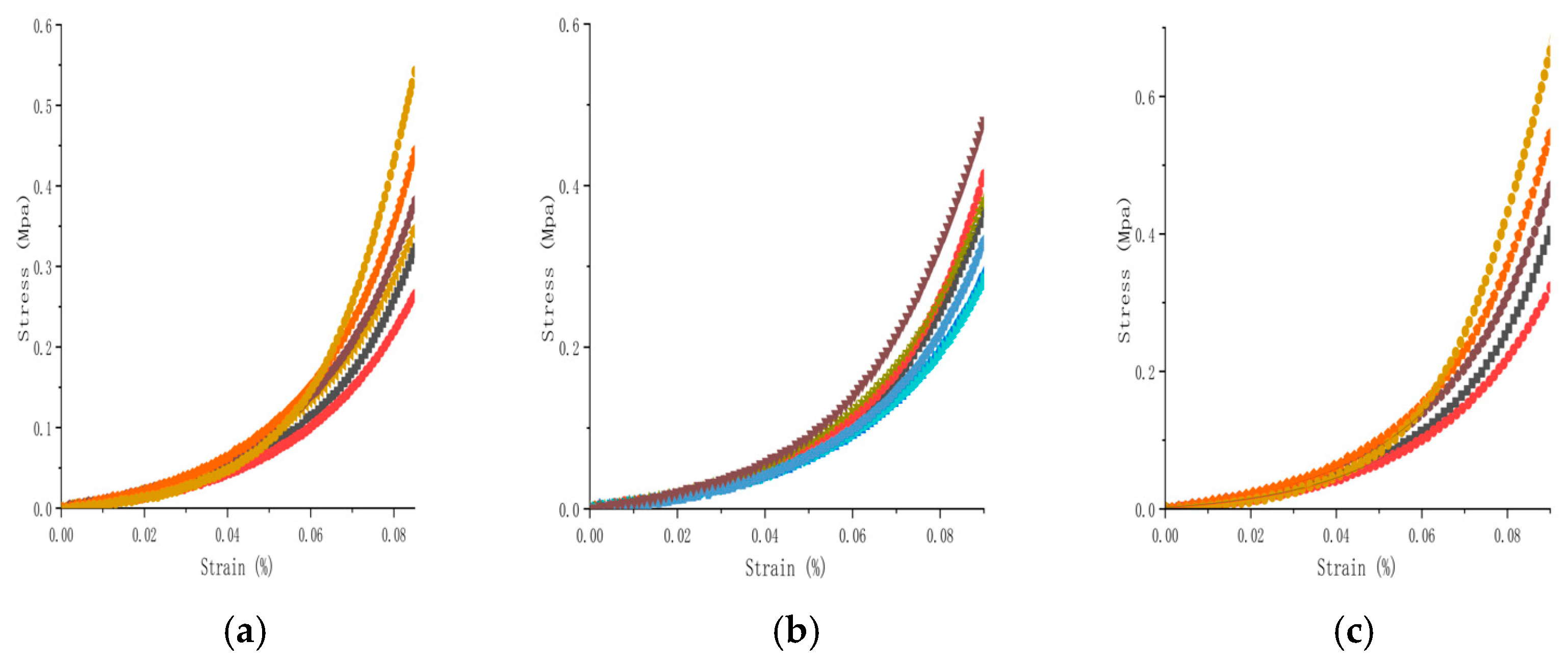 The load value at the critical elongation point (2.25 mm) decreased from 0.437 N in the first cycle to 0.382 N in the fifth cycle (a decrease of 12.6%), confirming that the pretreatment effectively eliminated the viscoelastic hysteresis effect (
