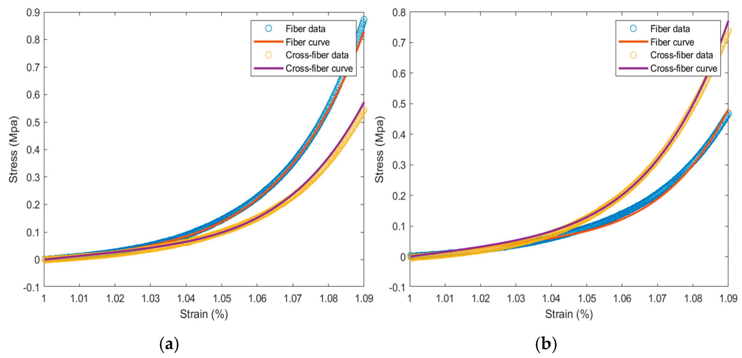 Stress and strain values were extracted from the recorded image sequences using MATLAB R2020a. The constitutive model parameters (c1,c2,c3,c4,c5,c6) were obtained through nonlinear regression analysis, and the goodness of fit was evaluated using the coefficient of determination (R2).