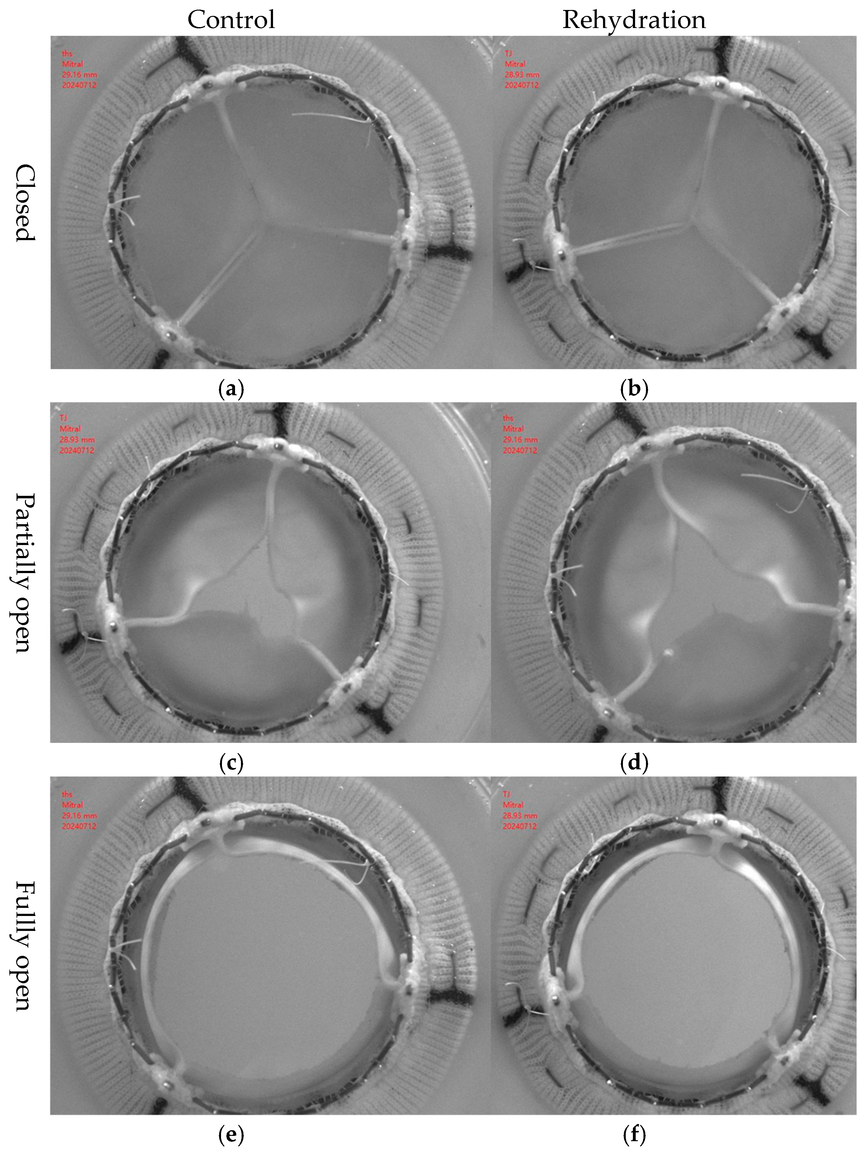 Figure 2). The experiment was carried out under physiological conditions. The simulated cardiac output was 5 L/min, and the heart rate was 70 bpm. A high-speed camera operating at a speed of 250 fps was used to capture the dynamic behavior of the lobes during pulsating flow. The aortic valve was made of 0.4 mm thick bovine pericardium. Under the abovementioned simulated cardiac output conditions, the original valve and the hydrated and rehydrated valves were compared. Valve performance parameters, including the effective orifice area (EOA), regurgitation rate, and transvalvular pressure gradient, were calculated according to ISO 5840-3 [
