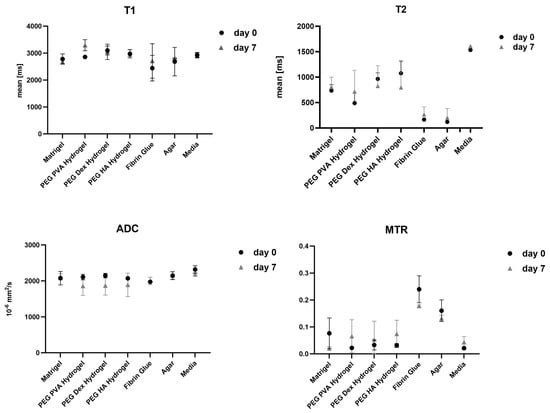 Graphical representation of T1, T2, apparent diffusion coefficient (ADC), and magnetiza-tion transfer ratio (MTR) values measured across different scaffold materials and cell culture media at different time points (day 0 and 7). Data are presented as mean ± standard deviation from three independent experiments. Each parameter reflects quantitative MR-based assessment of scaffold-specific properties under identical imaging conditions.