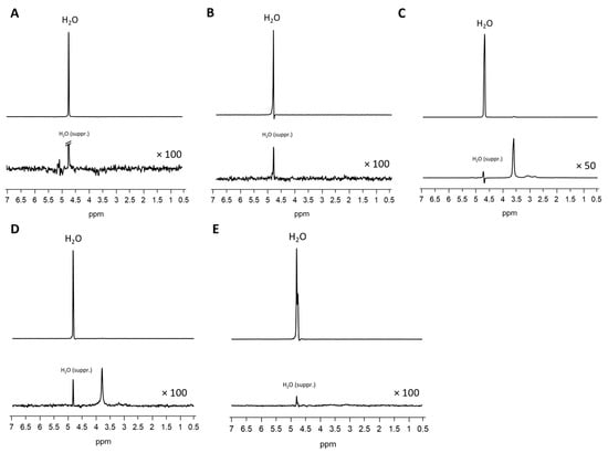 MRS of Matrigel® (A), fibrin glue (B), PEG PVA hydrogel (C), PEG Dex hydrogel (D), and HA PVA hydrogel (E). Upper lines: spectra without water suppression, lower rows: zoomed spectra with water suppression.