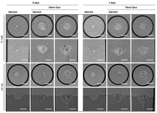 Cross-sectional (1st and 3rd row) and longitudinal axis (2nd and 4th row) images of tubes with SW1353 spheroids without and with fibrin glue and just fibrin glue. T1-weighted images (1st and 2nd row) were obtained using a spoiled gradient echo VIBE sequence. PD-weighted images were obtained using a TSE sequence. Scale bars represent 10 mm.
