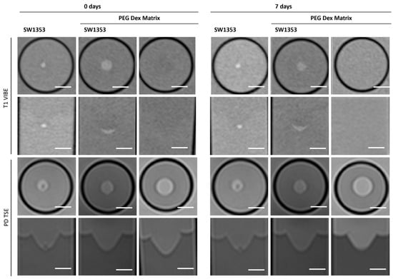 Cross-sectional (1st and 3rd row) and longitudinal axis (2nd and 4th row) images of tubes with SW1353 spheroids without and with PEG Dex hydrogel and just PEG Dex hydrogel. T1-weighted images (1st and 2nd row) were obtained using a spoiled gradient echo VIBE sequence. PD-weighted images were obtained using a TSE sequence. Scale bars represent 10 mm.