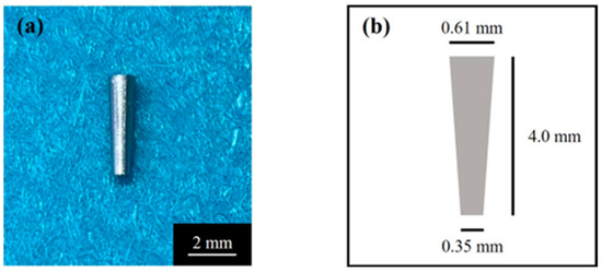 The cylindrical implant body used is shown in Figure 1. A tapered cylindrical Ti sample (JIS2 type, ASTM grade 2, 99.9% mass, Nissin, Kyoto, Japan) with a certain conicity (upper diameter 0.61 mm, lower diameter 0.35 mm, length 4.0 mm) was manufactured using a computer-aided design/computer-aided manufacturing device (Aadva Mill LD-I, GC Corp., Tokyo, Japan) based on standard triangulation data. Ti disks (JIS2 type, ASTM grade 2, 99.9% mass, Furuuchi Chemical, Tokyo, Japan) (12.0 mm diameter, 1.0 mm thickness) were used for atomic elemental analysis and X-ray diffraction.