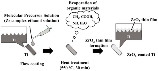 Ti implants were coated with ZrO2 (ZrO2/Ti) using the molecular precursor method [13,16,17]. The schematic illustration for the coating process is shown in Figure 2. 25 mL of a molecular precursor solution for the ZrO2 film (Zr complex ethanol solution; Zr4+ concentration = 0.32 mmol/g; TFTECH, Tokyo, Japan) was dropped onto the Ti surface. The cylinder samples were coated using flow coating, and the disk samples were coated using a spin coater (1H-D7, MIKASA, Tokyo, Japan) in a two-step mode: specifically, at 5 s 500 rpm, followed by 30 s 2000 rpm. Then, Ti implant specimens treated with precursor solution were then heat treated in a silica tube furnace (EPKPO12-K; ISUZU, Niigata, Japan) under atmospheric conditions. The heating temperature and time was 550 °C and 30 min, respectively. Thus, thin-film zirconia coatings can be obtained on Ti implants.