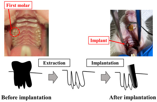 The implants were sterilized with ethylene oxide gas before implantation. The implants were inserted into the extraction sockets of the maxillary first molars of rats as previously reported [12,18,19]. Surgery was performed under general anesthesia, with ketamine hydrochloride administered intraperitoneally. (0.6 mg/kg; Daiichi Sankyo Propharma Co. Ltd., Tokyo, Japan). Sedation and analgesia were induced by injecting medetomidine hydrochloride (0.3 mg/kg; Nippon Zenyaku Kogyo Co. Ltd., Fukushima, Japan). Rats were awakened using atipamezole hydrochloride (0.15 mg/kg; Nippon Zenyaku Kogyo Co., Ltd., Fukushima, Japan). The right maxillary first molar was carefully extracted using osteoclastic forceps. Four ZrO2/Ti and four SLA/Ti implants were press-fit-inserted using root canal tweezers. The contralateral tooth was extracted in order to avoid occlusal pressure load on the implant body. After surgery, antibiotics (latamoxef sodium, 0.01 mg/kg; Shiomalin, SHIONOGI Co., Ltd., Osaka, Japan) were subcutaneously injected.