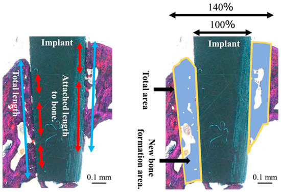 Histological evaluation of each section was performed randomly. After double staining with methylene blue and basic fuchsin, the sections were observed under a light microscope (Eclipse Ni; Nikon Corp., Tokyo, Japan; ×40 and ×100 magnification). The bone response toward the ZrO2/Ti and SLA/Ti implants was evaluated histologically and histomorphometrically. The bone-to-implant contact (BIC) ratio and bone mass (BM) were calculated using histomorphometric analysis. BIC was defined as the percentage of the length of the implant surface in direct contact with the bone, and BM was calculated as the percentage of newly formed bone around the implant. The BM and BIC were measured within the regions of interest (ROI), as determined in accordance with a previous study [21], as illustrated in Figure 4. The ROI is a box on a section whose vertical length is the length of the implant body and whose width is the width of the upper end of the implant plus 20% on both sides. The vertical and horizontal lengths of each section differed depending on the implant insertion direction and the cutting position of the sample; therefore, they were determined by measuring each sample individually. The BIC ratio and BM values were calculated using the results obtained from the image analysis (WinROOF, Visual System Division Mitani Co., Ltd., Tokyo, Japan).