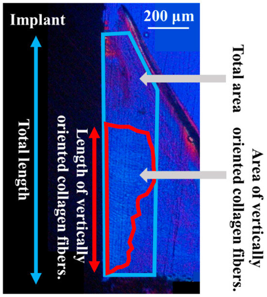 The orientation of the peri-implant soft tissue relative to the collagen fiber bundles was observed under a polarized light microscope (ECLIPSE LV100N POL, Nikon, Tokyo, Japan) to determine the soft tissue response toward the ZrO2/Ti and SLA/Ti implants. Histomorphometric evaluations were performed using the WinROOF image analysis system, based on a previous study [8]. The ROI was defined as shown in Figure 4. Measurements were taken only in the soft tissue area. Figure 5 shows a schematic drawing of the measurement of the total length or area of the vertically oriented collagen fibers around the implant. The total length or area of the length or area of soft tissue attachment toward the ZrO2/Ti and SLA/Ti implant surfaces was calculated. The length or area of the attachment site where the collagen fibers were oriented perpendicularly toward ZrO2/Ti and SLA/Ti was calculated. Vertical attachment ratio was calculated as the ratio of the vertical length or area to the total length or area. This value is denoted as the length or area as a measure of soft tissue integration.
