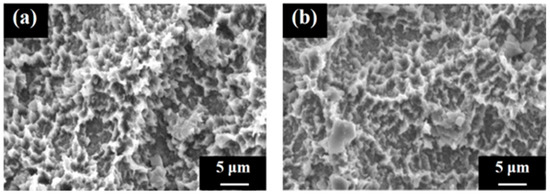 Figure 6 shows the surface appearances of the SLA/Ti and ZrO2/Ti cylinders obtained using SEM. No difference was observed in the surface appearance of the SLA/Ti and ZrO2/Ti cylinders. Both surfaces exhibited microscale dimples formed by irregular roughness on the rough sandblasted surfaces. Furthermore, no peeling or defects of the ZrO2 coating was observed.