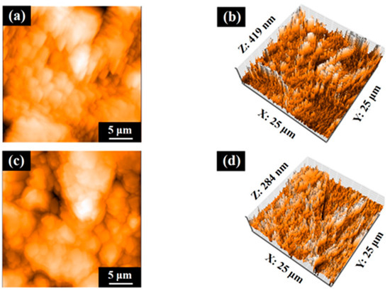 Atomic force microscopy profiles of cylinder samples. Images of (a,b) SLA/Ti and (c,d) ZrO2/Ti.