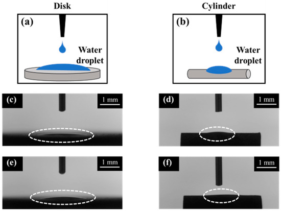 Contact angle measurement images of disk and cylinder samples. Illustration of contact angle measurements were also shown. (a) disk and (b) cylinder. Dotted circles show the water droplet on each sample. SLA/Ti (c) disk and (d) cylinder. ZrO2/Ti (e) disk and (f) cylinder. The dash lines indicate the water droplet.