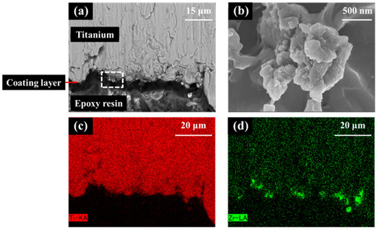 Scanning electron microscopy (SEM) image and X-ray spectroscopy (EDX) analysis of the zirconia-coated cylinder surface. (a) Low and (b) high images of the ZrO2/Ti sample SEM images. (b) is an enlarged photograph of the area enclosed in the box in (a). (c) Ti and (d) Zr mapping of EDX.