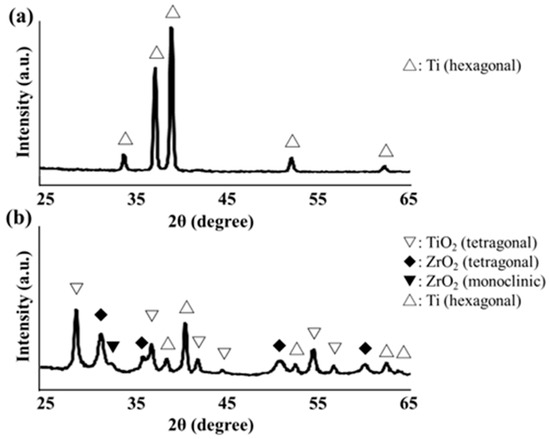 Figure 11 shows the XRD profiles of the SLA/Ti surface and zirconia films on the SLA/Ti disks. For SLA/Ti disk, only hexagonal Ti peak was identified (Figure 11a). A deposited coating with zirconia structures was confirmed for ZrO2/Ti specimen. Corresponding to monoclinic zirconia, a peak was observed at 31.5°, whereas peaks at 30.3°, 35.3°, 50.4°, and 60.2° were observed for tetragonal zirconia. Ti peaks were also observed.