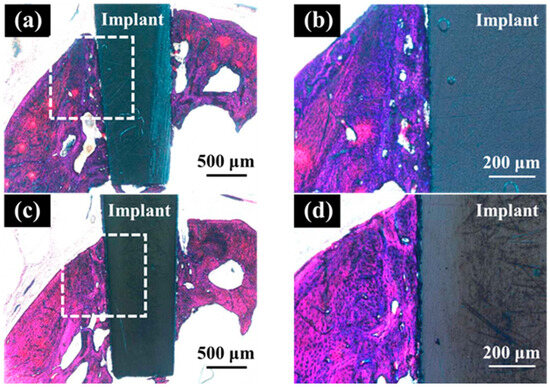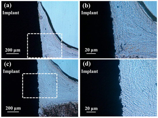 The implants were not protected with caps. Three weeks after implantation, the implants, including the surrounding bone and soft tissues, were excised to observe the early response of the surrounding tissue according to previous reports [8,13,20]. Each specimen was first stored in a 10% neutral-buffered formalin solution for fixation and then dehydrated by sequential immersion in 70%, 80%, 90%, 96%, and 100% ethanol. Subsequently, each specimen was embedded in methyl methacrylate resin. After resin polymerization, a non-decalcified thin section was prepared by a cutting and polishing procedure using the EXAKT cutting–grinding system [20]. The cut sections were placed parallel to the implant axis. Each section was polished with waterproof paper (800, #1200, #2000, #2400, and #4000) and the thickness was finally approximately 70 to 80 μm. One implant was divided at the midline and two sections were obtained.