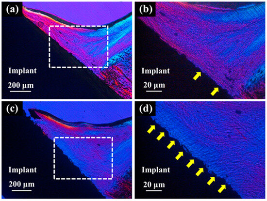 Polarized light micrographs of soft tissues around SLA/Ti and ZrO2/Ti. (a,b): SLA/Ti implant. (c,d): ZrO2/Ti implant. (b,d) are higher magnification images of (a,c), respectively. Yellow arrow: vertically oriented collagen fibers. Collagen fibers exhibit birefringence due to their anisotropic structure. In a polarizing microscope, the color of the transmitted light indicates the direction or orientation of the collagen fibers, allowing visual observation of their orientation. Thus, collagen fibers parallel to Ti implant and those to perpendicular showed different colors.