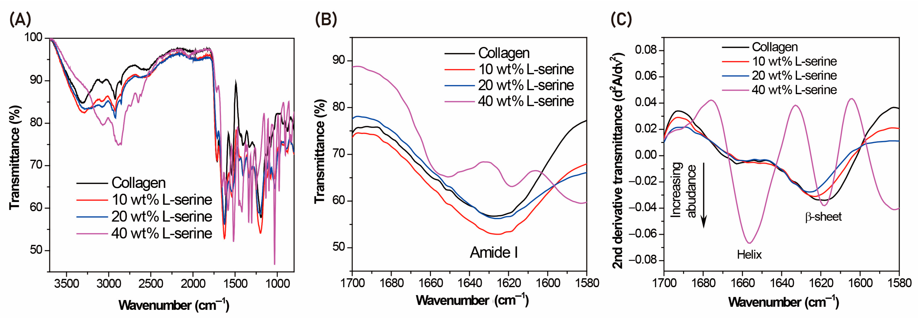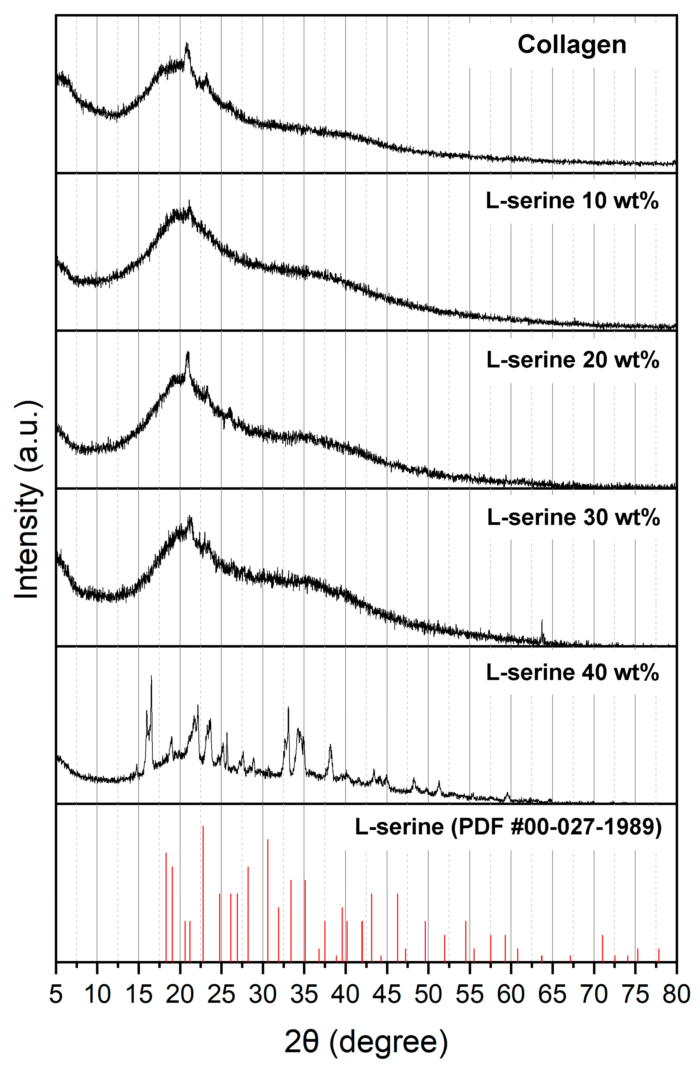 15]. In contrast, L-serine incorporation represents a simple, aqueous, and biocompatible modification approach that avoids harsh reagents while maintaining key intrinsic characteristics of collagen.