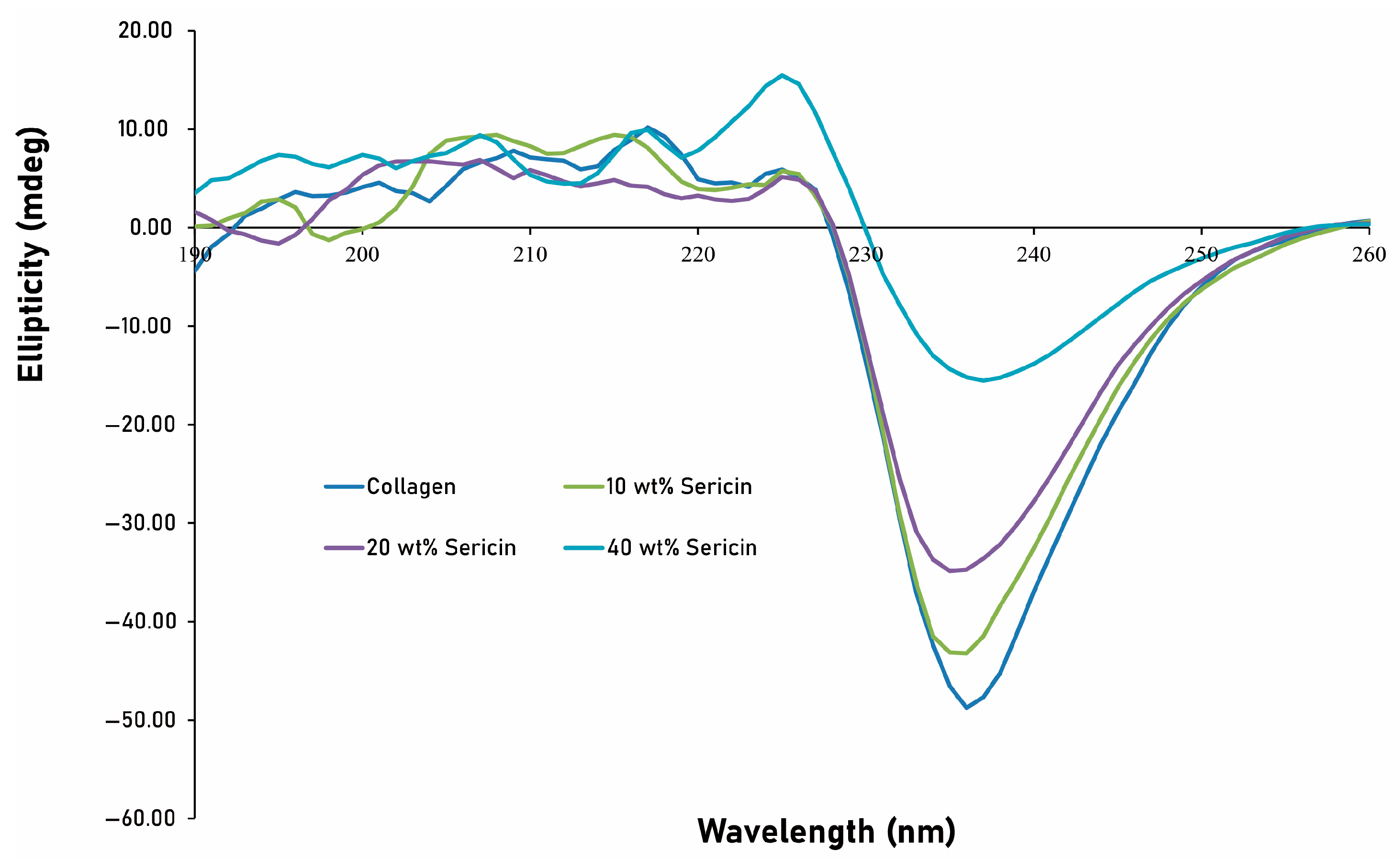 In contrast, at 40 wt%, the emergence of crystalline domains and increased β-sheet signatures suggested that excessive serine content could disrupt helicity and promote aggregation (