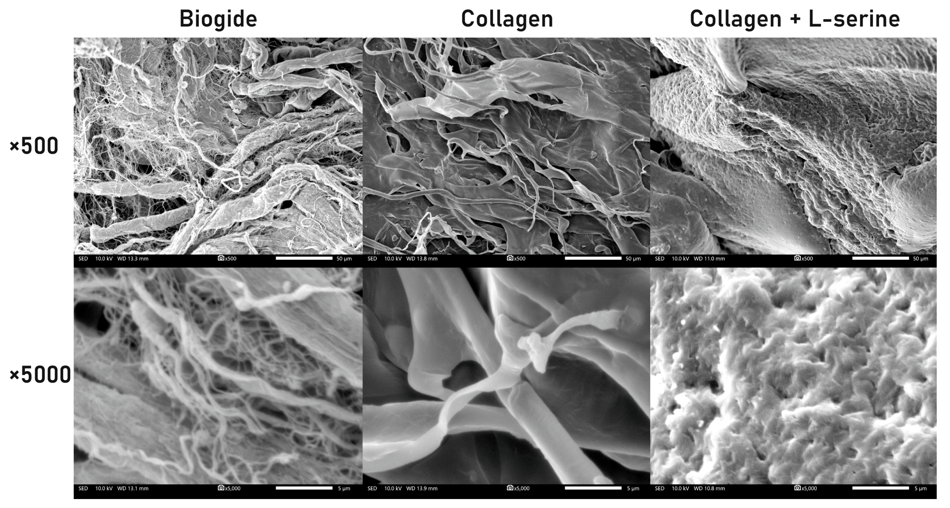 The surface morphology of Biogide®, collagen, and collagen + L-serine specimens was examined by scanning electron microscopy (JSM-IT200, JEOL, Tokyo, Japan). For sample preparation, the hydrogel form of collagen + L-serine was fixed in 2.5% glutaraldehyde for 2 h at 4 °C, followed by sequential dehydration in graded ethanol solutions (30%, 50%, 70%, 90%, and 100%). After dehydration, the samples were slowly dried at room temperature to minimize structural collapse and then sputter-coated with a thin platinum layer. SEM images were obtained at magnifications of ×500 and ×5000 under an accelerating voltage of 10 kV, providing detailed views of fibrillar organization and surface topography. SEM imaging was performed using two independent samples (n = 2), with representative micrographs collected from multiple regions of each specimen.