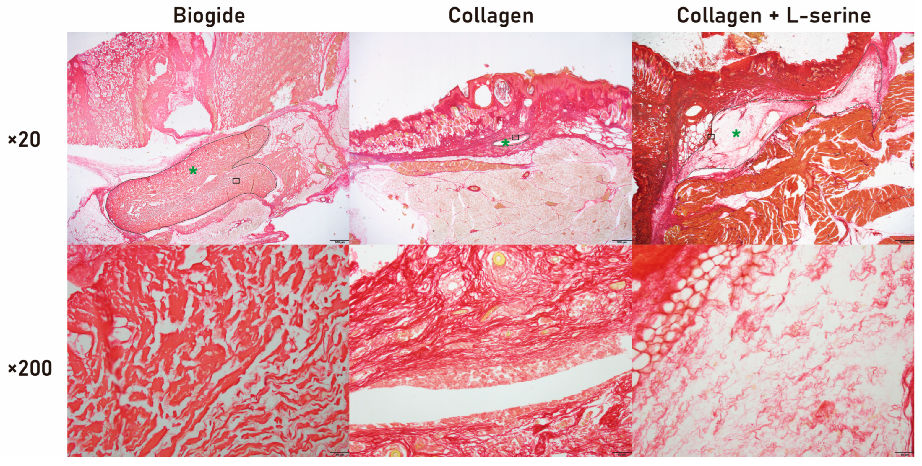 Figure 3). In vivo experiments further showed that collagen containing 40 wt% L-serine exhibited slower resorption compared with unmodified collagen, although its persistence remained lower than that of the commercially processed collagen membrane, Bio-Gide