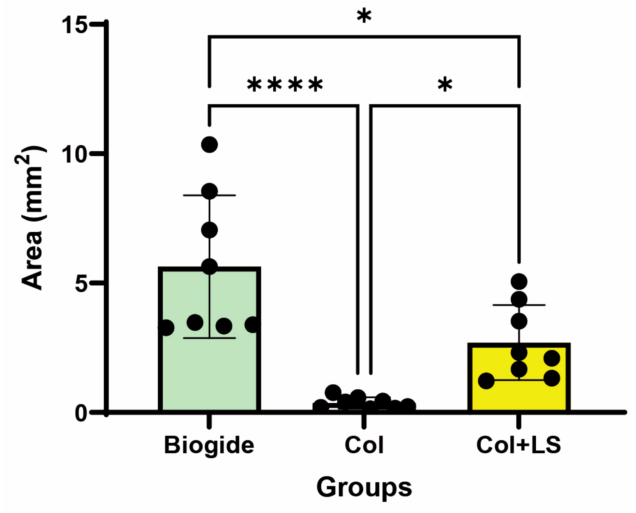 Quantification of residual graft area was performed exclusively on these histological sections. Digital images were analyzed using SigmaScan Pro 5.0 (SPSS Inc., Chicago, IL, USA). The residual graft was identified based on its dense, eosinophilic collagen appearance. Using the manual tracing tool, the boundary of the remaining graft material was outlined, and the software automatically calculated the enclosed area in square millimeters. Three non-overlapping sections were measured per sample, and the mean value was used for statistical comparison.