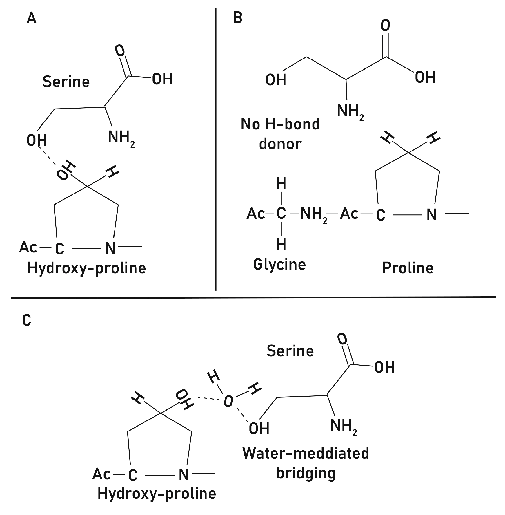 24]. In hydrated protein matrices, hydroxyl-containing amino acids can promote both direct hydrogen bonding and water-mediated bridging interactions, leading to tighter intermolecular packing and the formation of a more structured hydration shell [