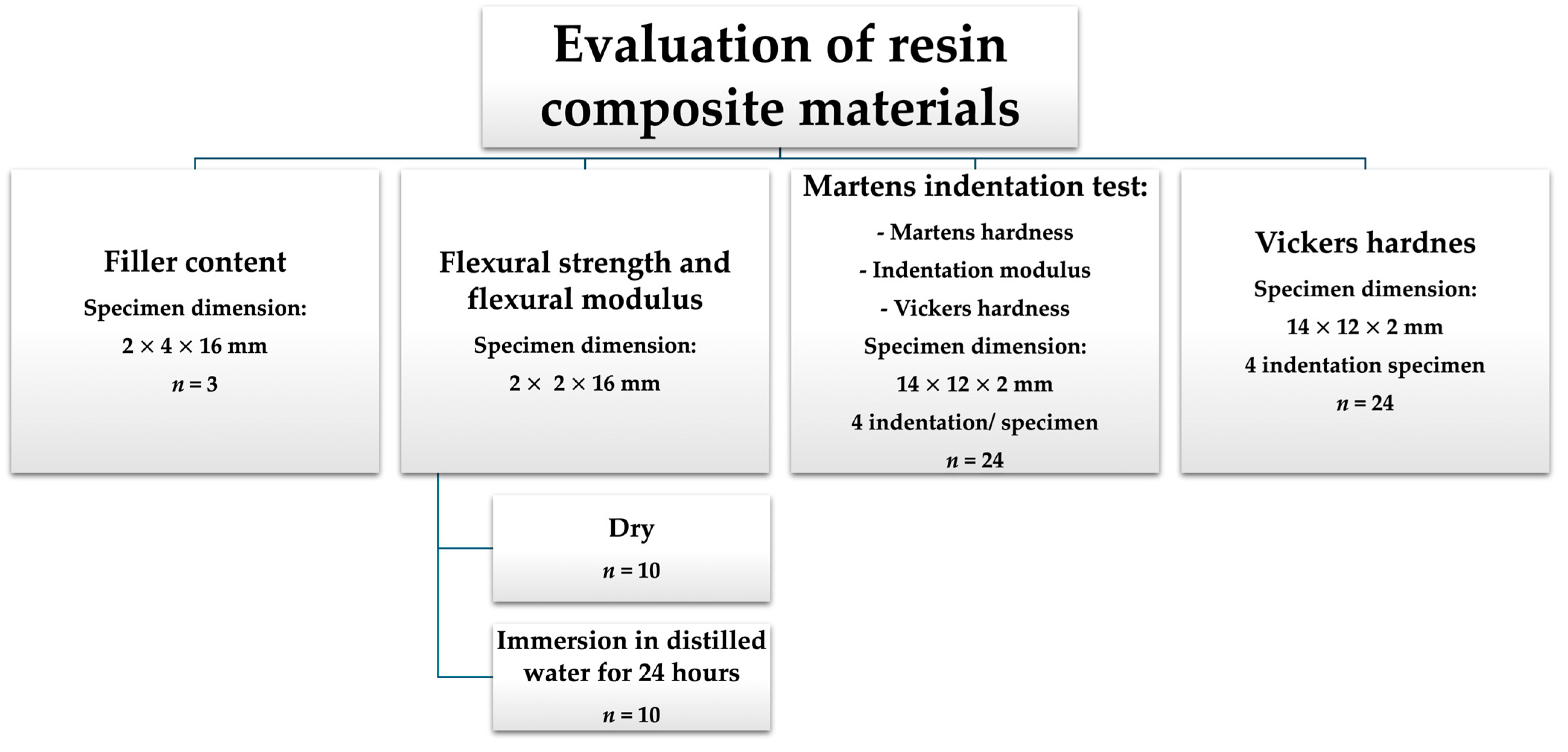 The sample sizes (Figure 1) for filler content and flexural tests followed a previous validated study [13]. For the Martens indentation and Vickers hardness tests, sample sizes were determined using G*power software (Version 3.1.3; Heinrich Heine University, Germany), where an effect size (f = 0.40) was used, corresponding to a moderate-to-large effect and selected to reflect the substantial differences typically observed among resin composites, at a significance level of α = 0.05.