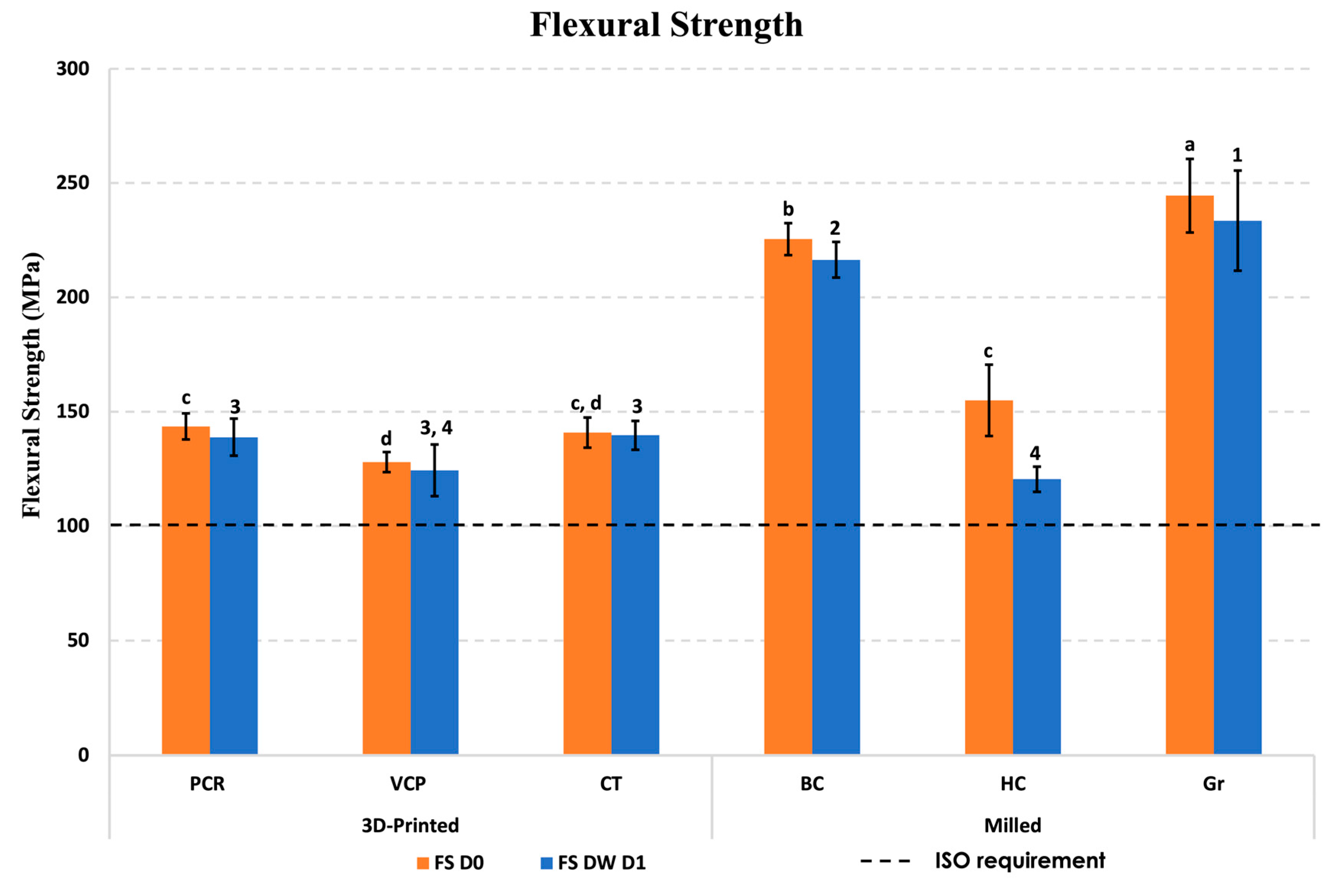 Figure 2. Flexural strength (FS) of the investigated materials at baseline (D0) and after 1-day storage in distilled water (DW D1). Different superscript letters indicate significant differences in FS between different materials at D0 (p ≤ 0.05), while different superscript numbers indicate significant differences in FS between different materials at DW D1 (p ≤ 0.05).