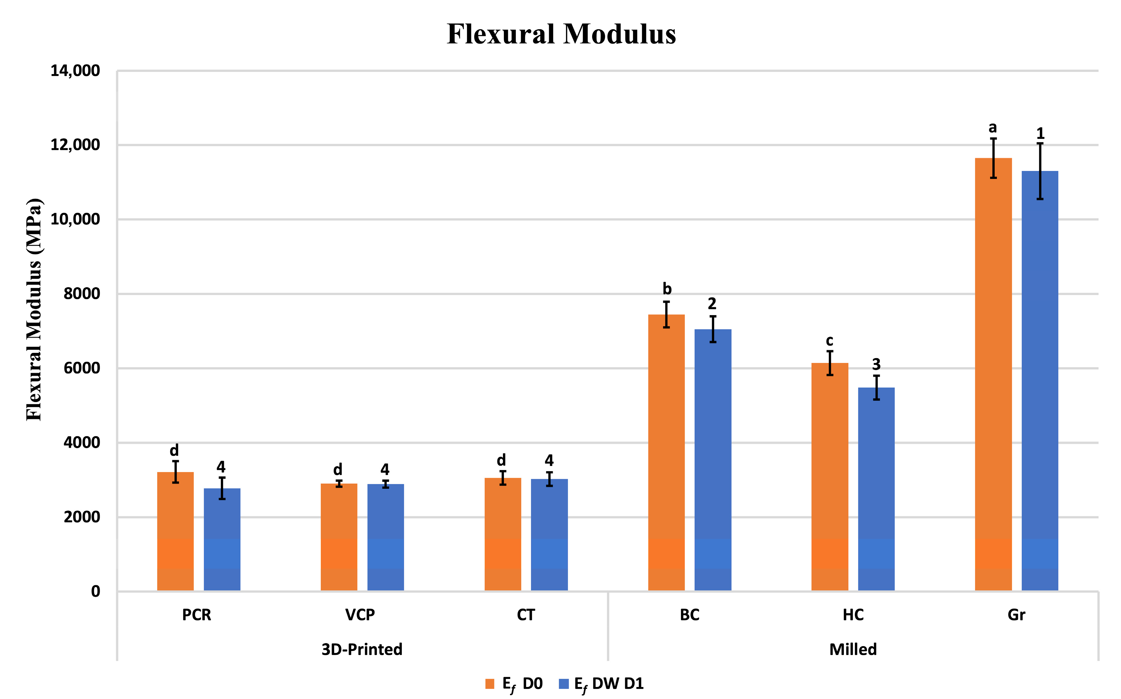 Figure 3. Flexural modulus (Ef) of the investigated materials at baseline (D0) and after 1-day storage in distilled water (DW D1). Different superscript letters indicate significant differences in Ef between different materials at D0 (p ≤ 0.05), while different superscript numbers indicate significant differences in Ef between different materials at DW D1 (p ≤ 0.05).