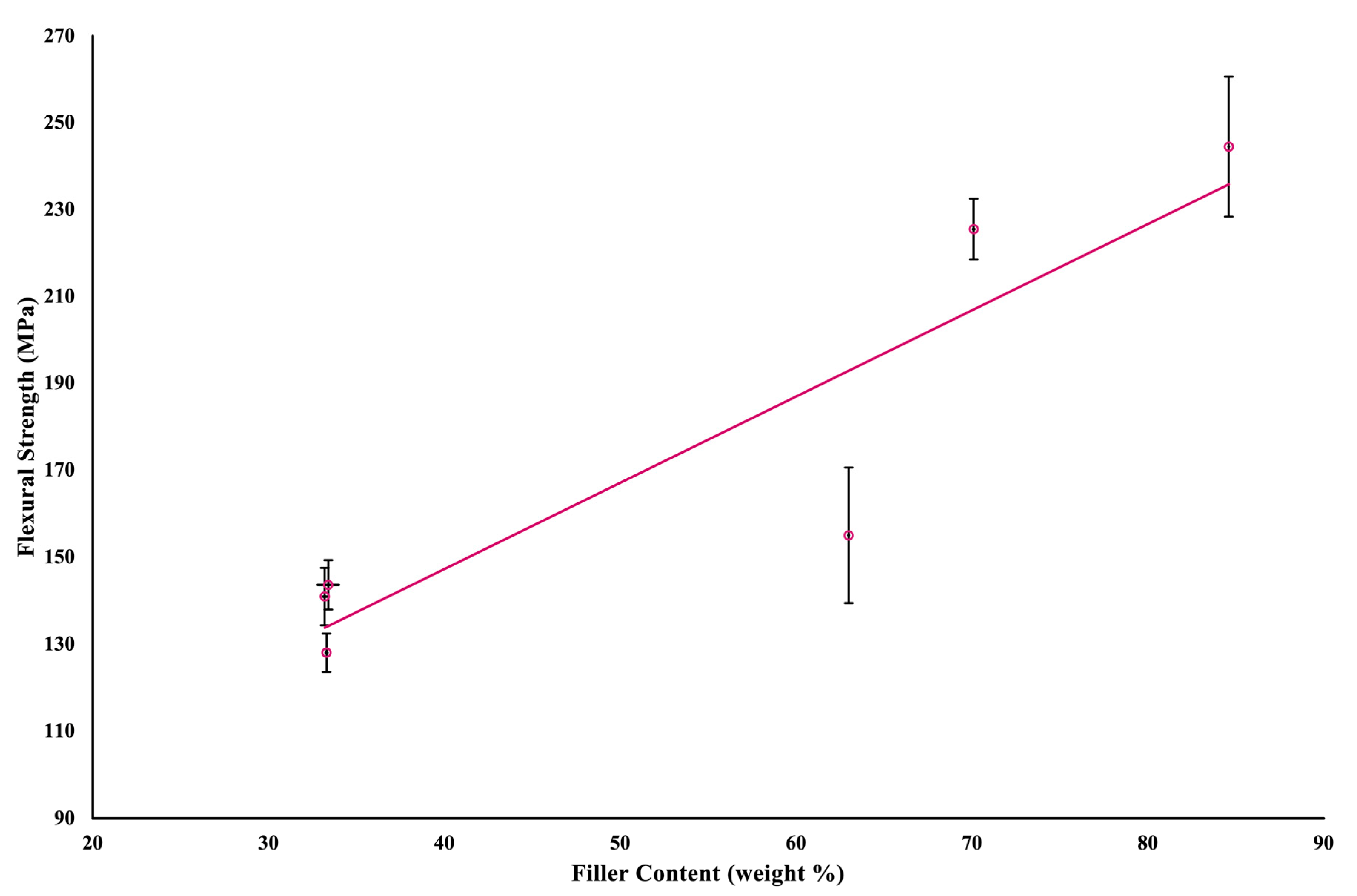 Figure 4. A scatter plot and linear regression of the correlation between flexural strength and filler weight. The circles represent the mean values, and the lines indicate the standard deviations.