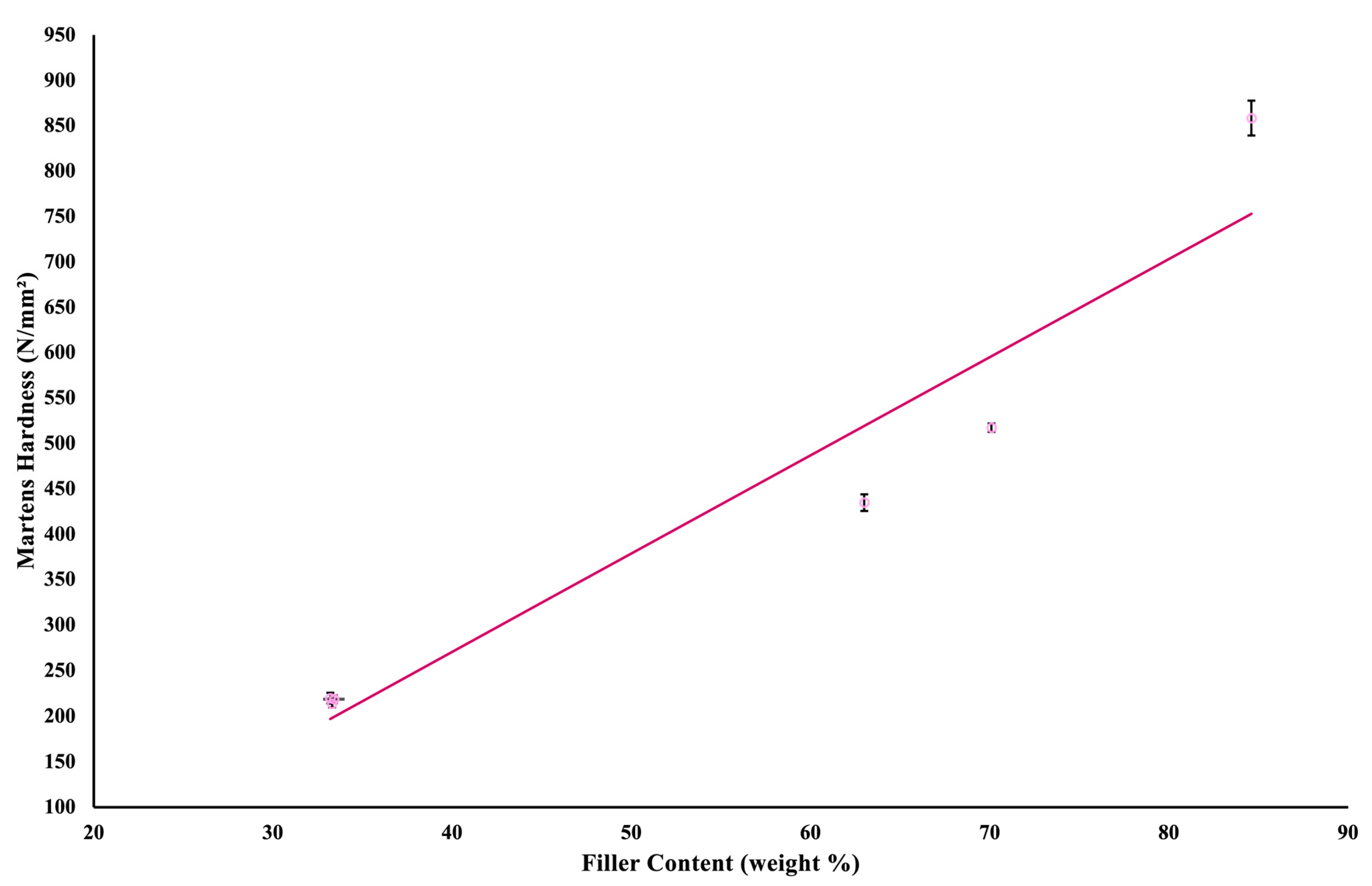 Figure 5. A scatter plot and linear regression of the correlation between Martens hardness and filler weight. The circles represent the mean values, and the lines indicate the standard deviations.