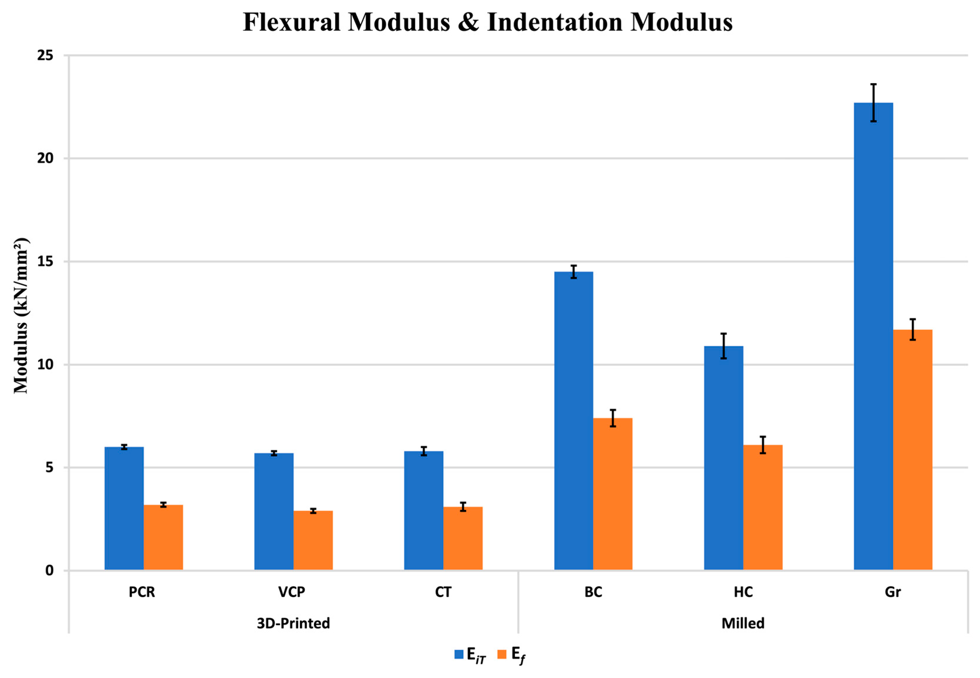 HM of the 3D-printed resin composites was approximately equal, around 217 N/mm2, and in contrast, the HM of the milled resin composite blocks exhibited a wider range from 434.7 to 858.4 N/mm2. Similarly, the EiT of the 3D-printed materials was relatively consistent, around 5.8 kN/mm2, while the EiT of the milled blocks demonstrated a diverse range, varying from 10.9 to 22.7 kN/mm2.