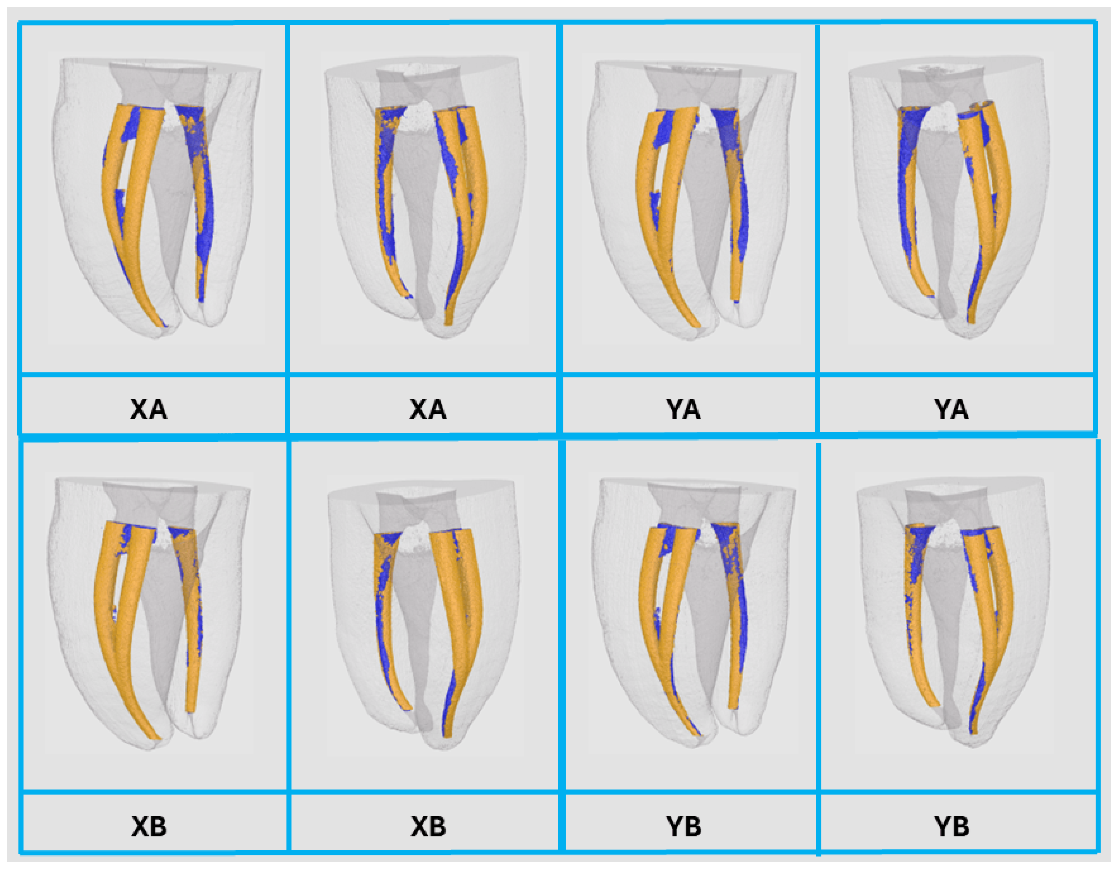 - Sivakumar, M.; Nawal, R.; Talwar, S.; Baveja, C.P.; Kumar, R.; Yadav, S.; Kumar, S. Shaping, and disinfecting abilities of ProTaper Universal, ProTaper Gold, and Twisted Files: A correlative microcomputed tomographic and bacteriologic analysis. Endodontology 2023, 35, 54–59. [Google Scholar] [CrossRef]