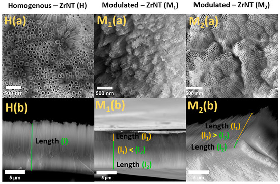 SEM micrographs: Row 1, top view of ZrNTs (homogenous diameter, H-ZrNTs; modulated type 1, M1-ZrNTs; modulated type 2, M2-ZrNTs; Row 2, cross-sectional view of ZrNTs (H-ZrNTs—uniform length (l); M1-ZrNTs—l1 < l2; M2-ZrNTs—l1 > l2).