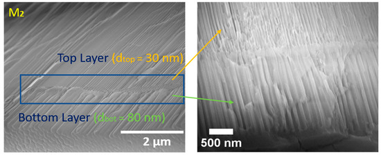 SEM micrographs: (left) cross-sectional view of M2; (right) high-magnification view of the interface.