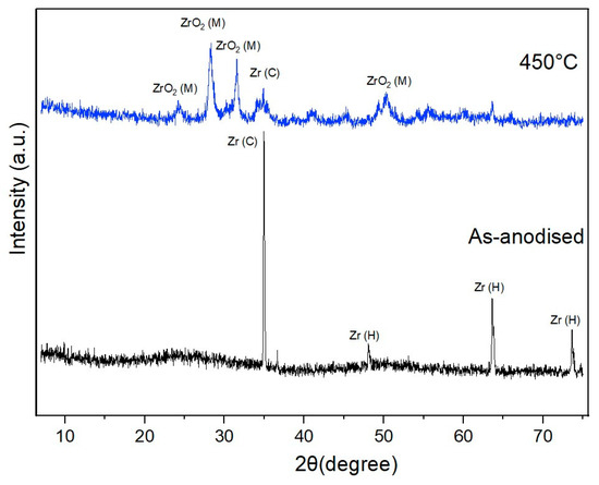 XRD spectra of ZrNTs as anodized and annealed at 450 °C.